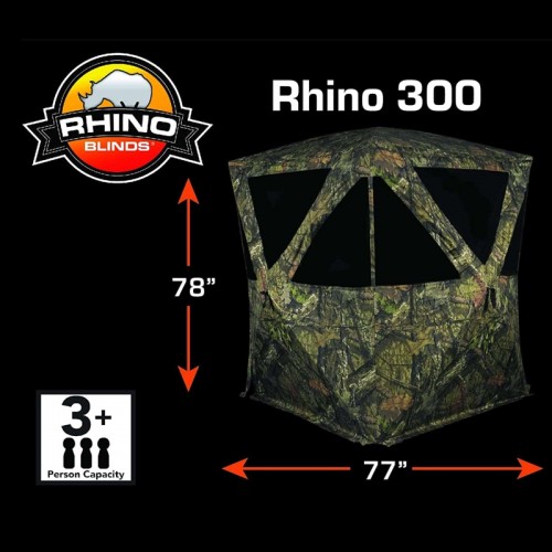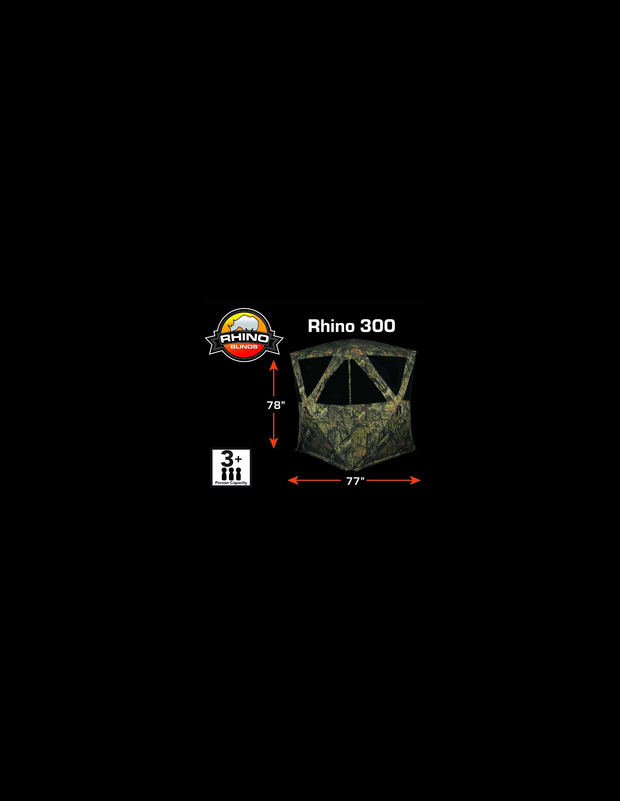 El Blind R300 tiene capacidad para 2 o 3 cazadores y una altura central de 188 cm (74") con un espacio de 147 cm x 147 cm (58" x 58"). Está fabricada con poliéster de 300 deniers, con tejido tanto horizontal como vertical. Los Rhino Blinds son fáciles de montar y desmontar; con un poco de práctica, se puede montar rápidamente en tan solo 60 segundos una vez que se saca de la bolsa de transporte.