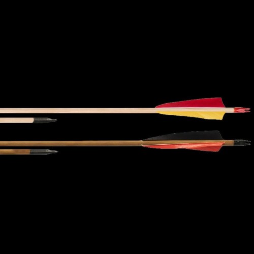 Flecha de Madera completa fabricada con vástago de Abeto Top Europa, con Plumas Naturales, Culatín tipo Classic y Punta de Acero.