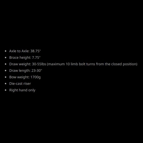 Eje a eje: 38,75" Fitsmelle: 7,75" Potencia: 30-55 lbs (máximo 10 vueltas de cerrojo desde posición cerrada) Longitud de apertura: 23-30" Peso : 1700g. Cuerpo fundido a presión. Solo para diestros.